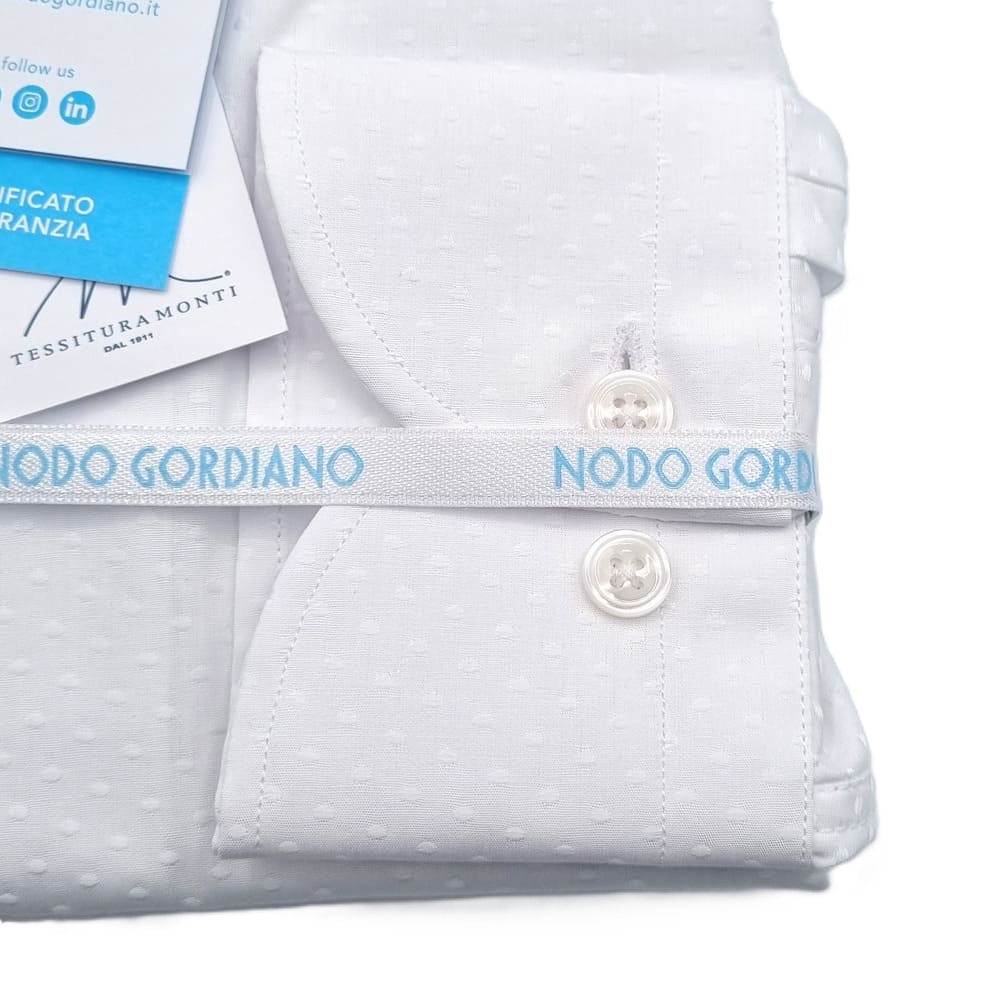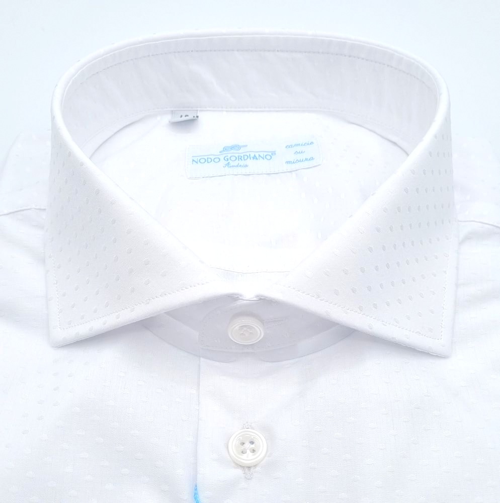 Camicia Bianca francese, tessuto Jacquard, fantasia a pois, cotone makò, filato 120 Superior, facile stiro (tessitura Monti).