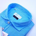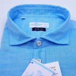 Camicia uomo slim fondo Turchese pois bianco, francese, in popeline, cotone lavato.