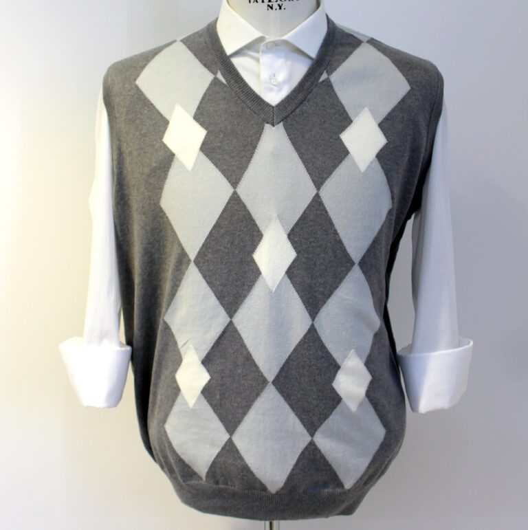 Smanicato gilet in cotone ‘Wool Island’ a rombi grigio – bianco.
